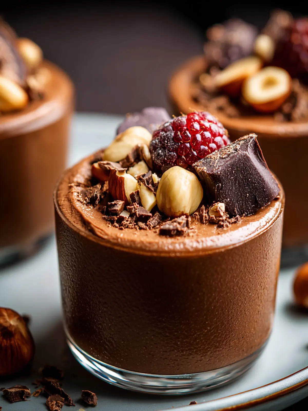 A rich and creamy dark chocolate mousse topped with toasted hazelnuts.
