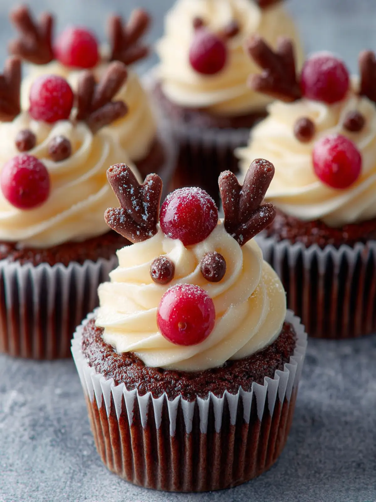 Frosting: A rich chocolate frosting elevates these cupcakes beautifully. Not only does it add a deep flavor, but it also contrasts nicely with the bright decorations, making those reindeer features pop.