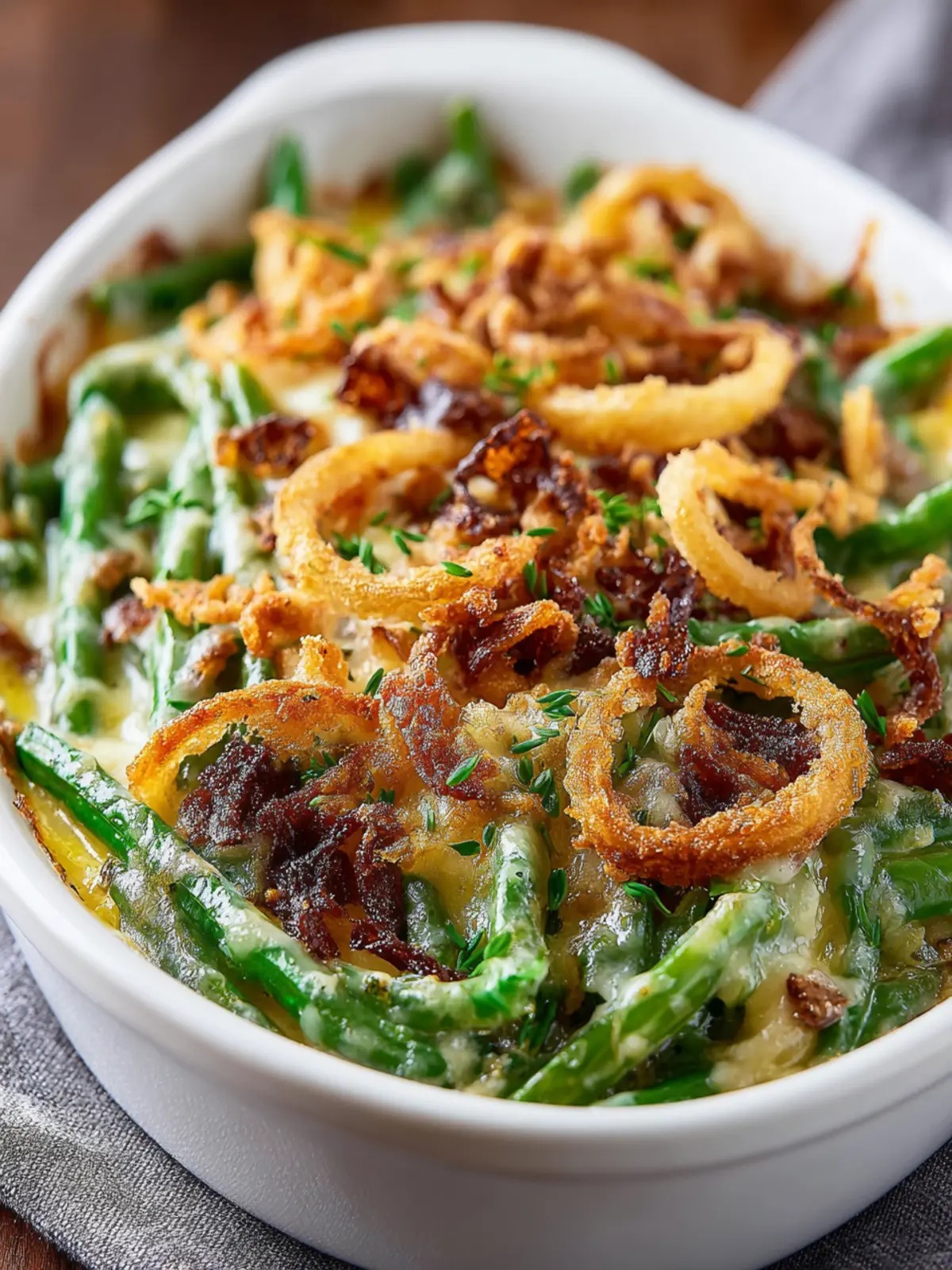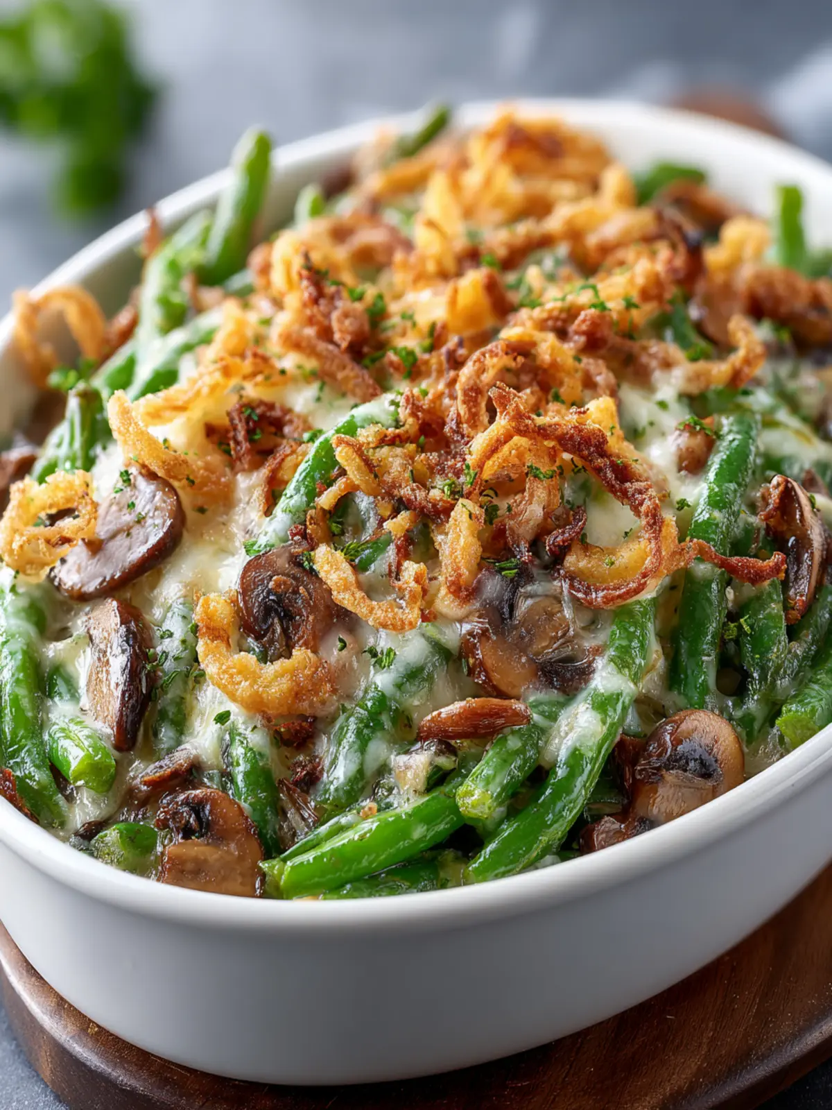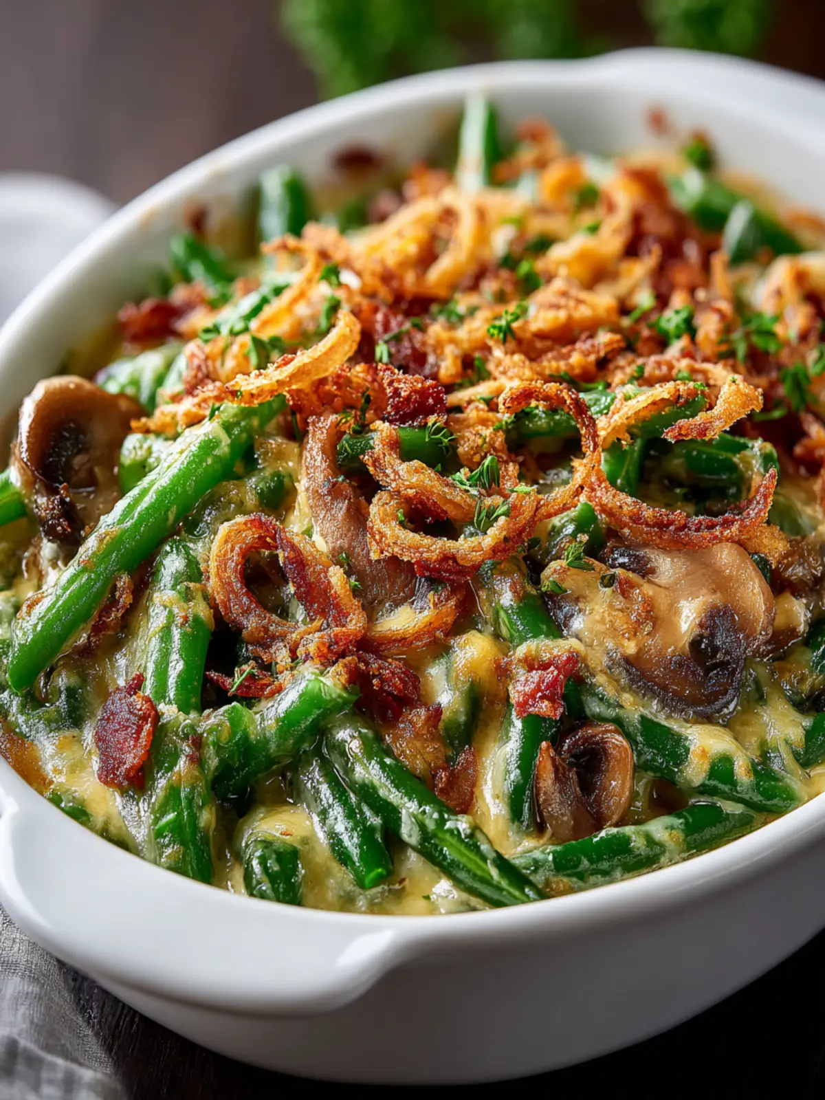 A cozy green bean casserole with a creamy mushroom sauce and crispy fried onions, perfect for family gatherings.