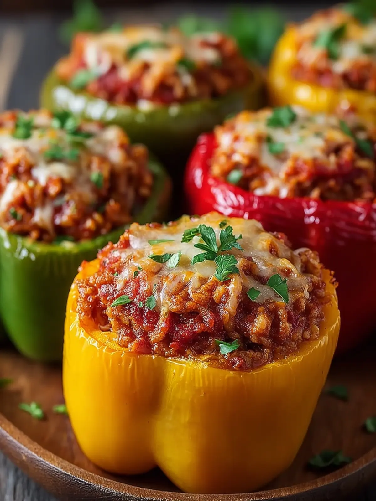 Delicious stuffed bell peppers filled with turkey, rice, and cheese, baked to perfection.