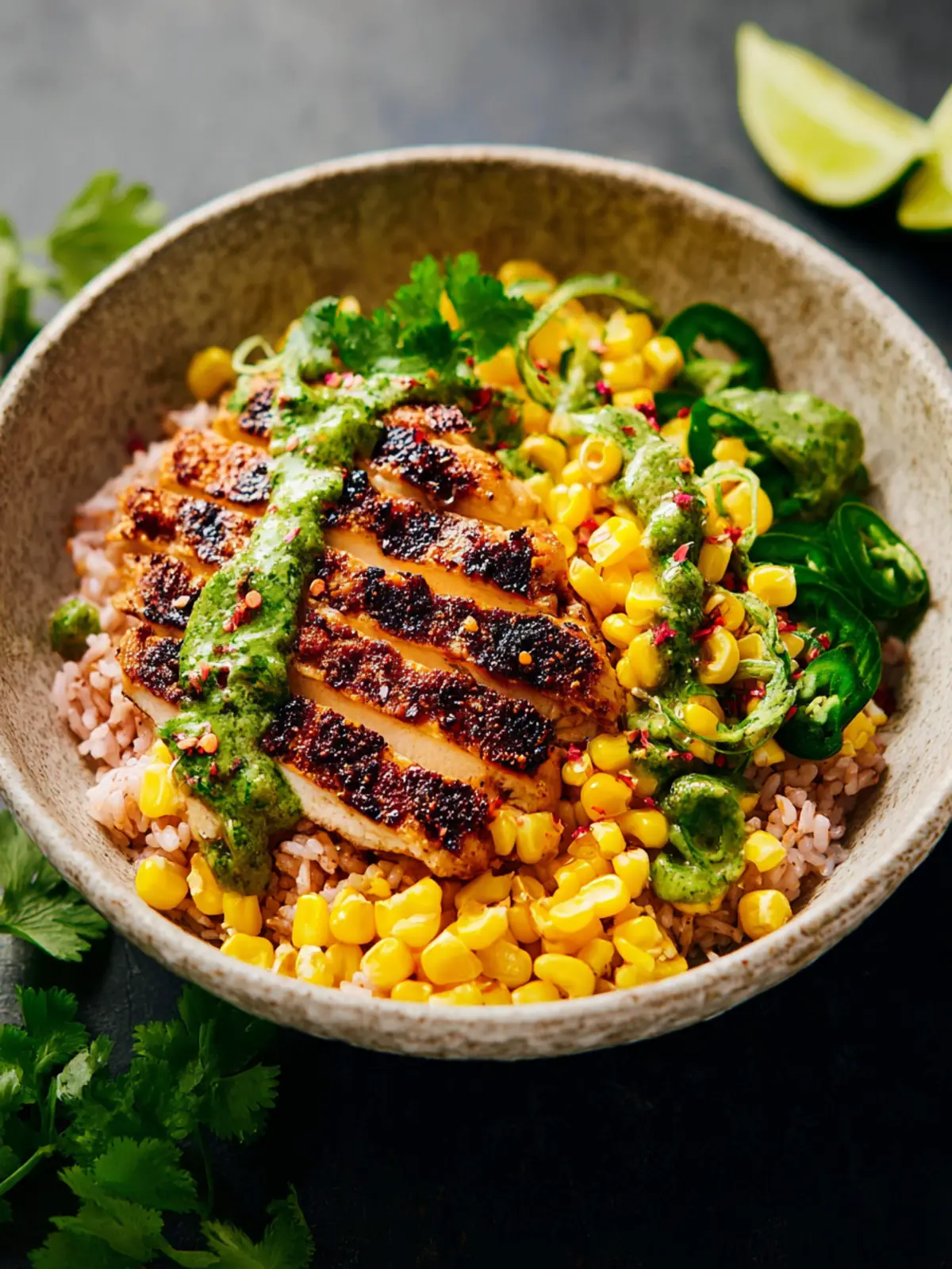 - Assemble: Layer rice into bowls. Add chicken, then spoon over the corn topping. Top with diced avocado and any additional toppings. Drizzle the chili lime sauce generously over everything. Enjoy!