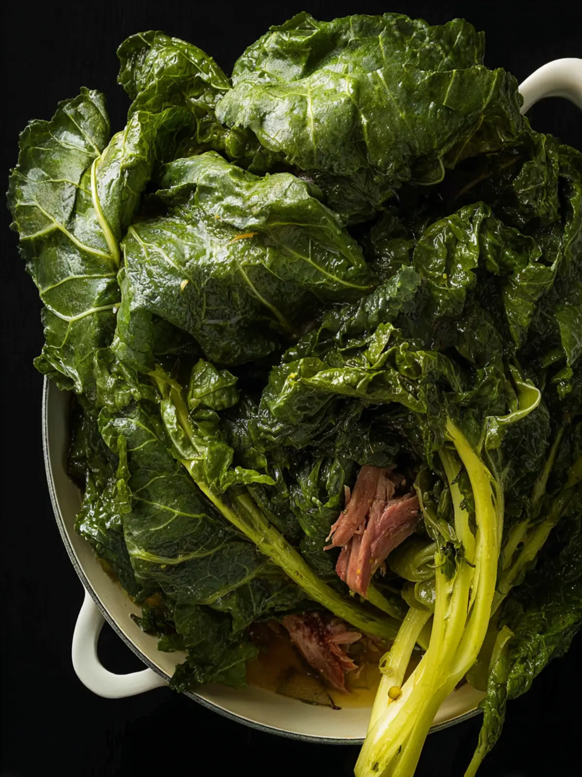 - Most of the meat will have fallen off the bone, but shred any remaining large pieces and stir back into the greens and serve.